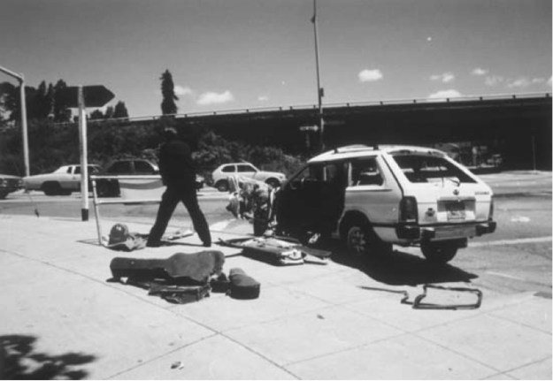 Another contention of the federal government, to justify their investigative focus solely on the activists and over one-hundred and thirty of their friends and family members, was that Judi “had to have known” the bomb was on the back seat, because she had supposedly laid her guitar case on top of it, which they explained had caused the case to be damaged “beyond recognition.” However, government photographs show the guitar case on the sidewalk, quite recognizable.