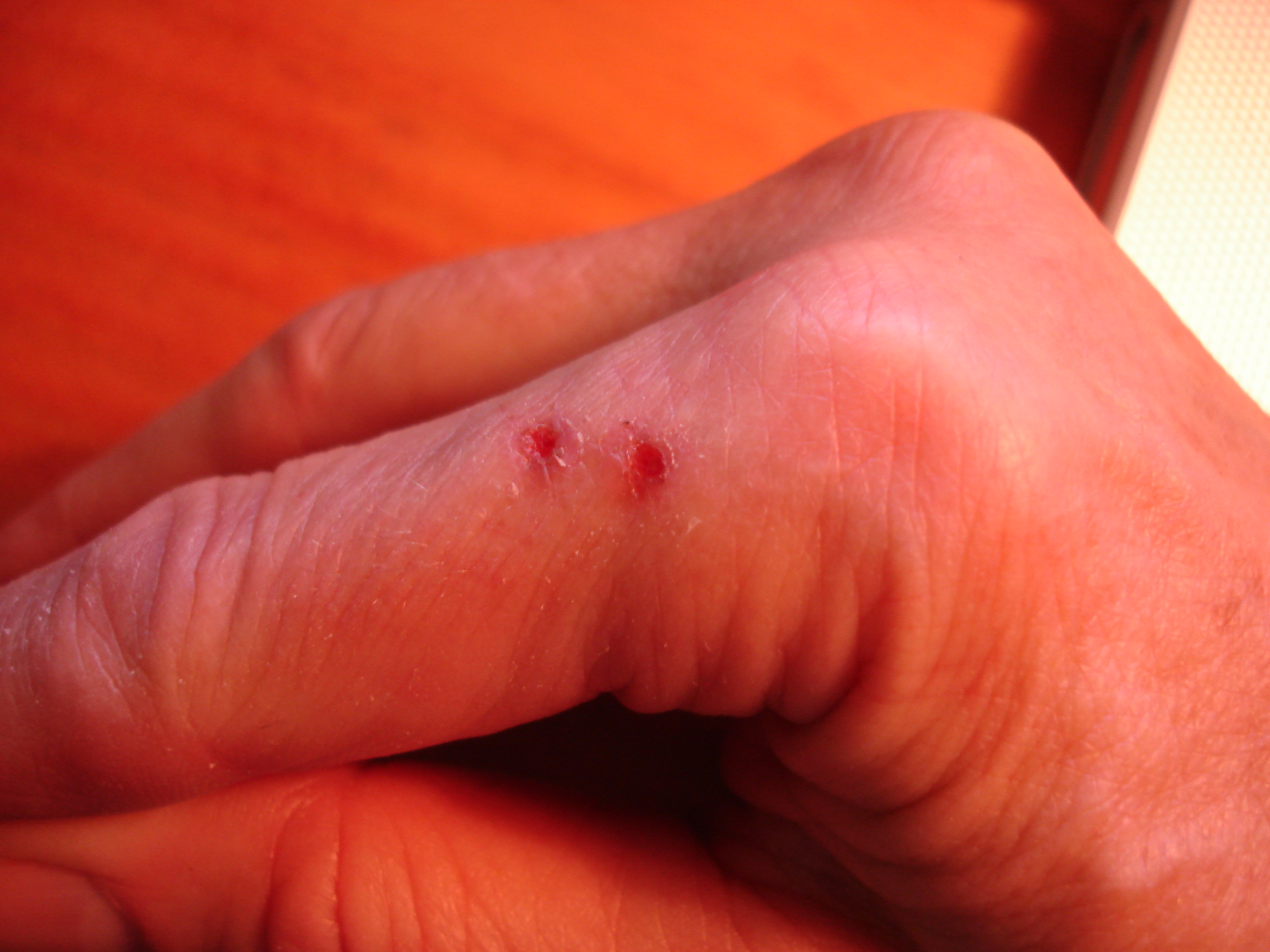 I woke to find these two on my right hand on the morning of February 8, 2011. These were also painless and bloodless, though they itched a bit.